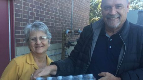 Farmers Mutual Insurance donated supplies of bottled water to Whitko Middle School and Indian Springs Middle School Boosters to be used in concession stands during middle school athletic events. Pictured are Loren Fry, Farmers Mutual Insurance Agent, and Vicky Borders, Buildings and Grounds Manager, Indian Spring Middle School.